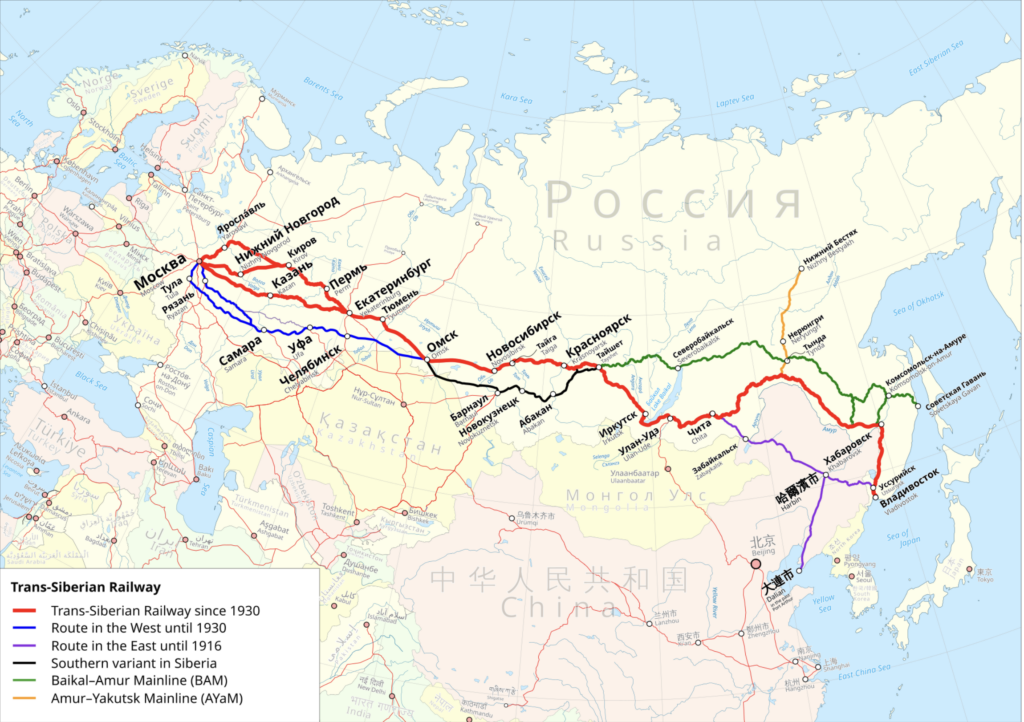 During the period of the Russian Empire, government ministers —personally appointed by Alexander III and his son Nicholas II— supervised the building of the railway network between 1891 and 1916. Even before its completion, the line attracted travelers who documented their experiences. Since 1916, the Trans-Siberian Railway has directly connected Moscow with Vladivostok. As of 2021, expansion projects remain underway, with connections being built to Russia’s neighbors Mongolia, China, and North Korea. Additionally, there have been proposals and talks to expand the network to Tokyo, Japan, with new bridges or tunnels that would connect the mainland railway via the Russian island of Sakhalin and the Japanese island of Hokkaido.